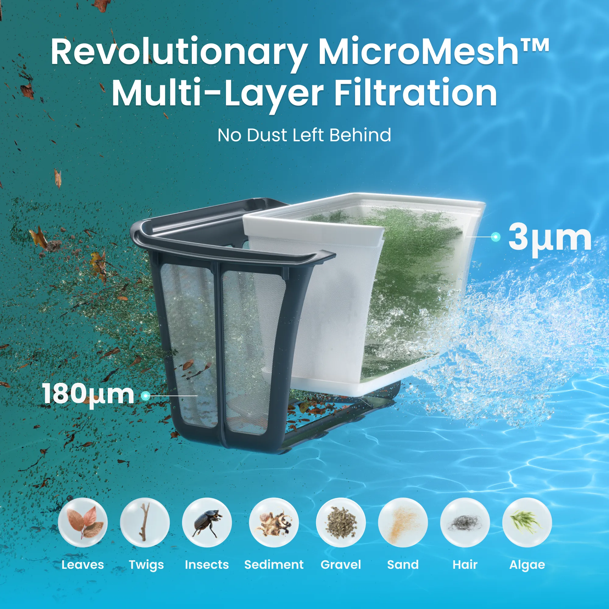 While the product name and main functions remain the same, the 2025 version features three key upgrades: longer battery life (up to 180 minutes vs. 150 minutes), full mobile app control (for mode switching, cleaning logs, and firmware updates), and an optional ultra-fine 3μm Replaceable MicroMesh™ filter in addition to the standard 180μm basket.