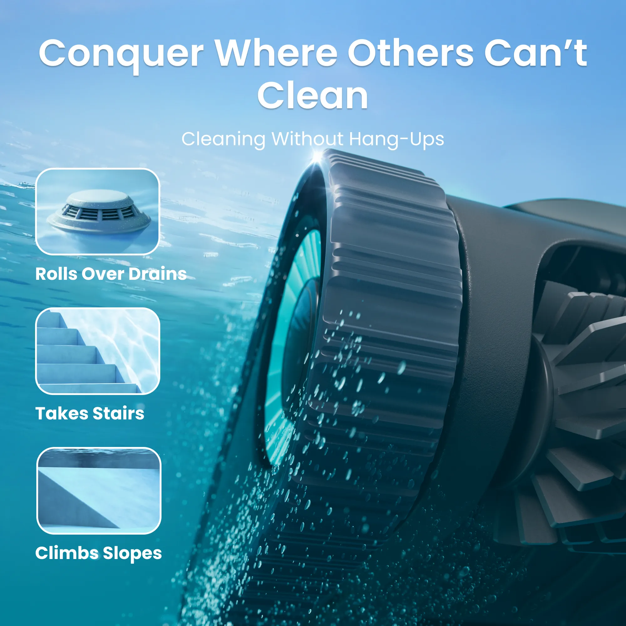 The suction of your pool drain may pull your device onto it, preventing the device from continuing its cleaning operations. Do not, under any circumstances, open the drain outlet while your device is cleaning the pool. lf the device has become stuck, it will adjust its propulsion and workfree within 3 minutes.